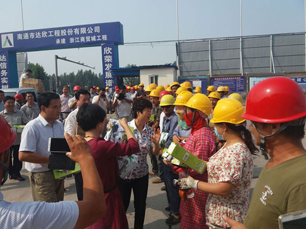 7月6日,第三、第十工程公司承建的邯鄲商貿(mào)城項目,迎來了邯鄲市委、市政府、市總工會組成的慰問團。慰問團一行向奮戰(zhàn)在施工一線的廣大干部職工發(fā)放了夏季慰問品??偣飨诂F(xiàn)場發(fā)表了熱情洋溢的講話,高度贊譽達欣是一支過硬善戰(zhàn)的施工隊伍,并勉勵全體參戰(zhàn)人員鼓足干勁,保證工程按期封頂,按期交工。