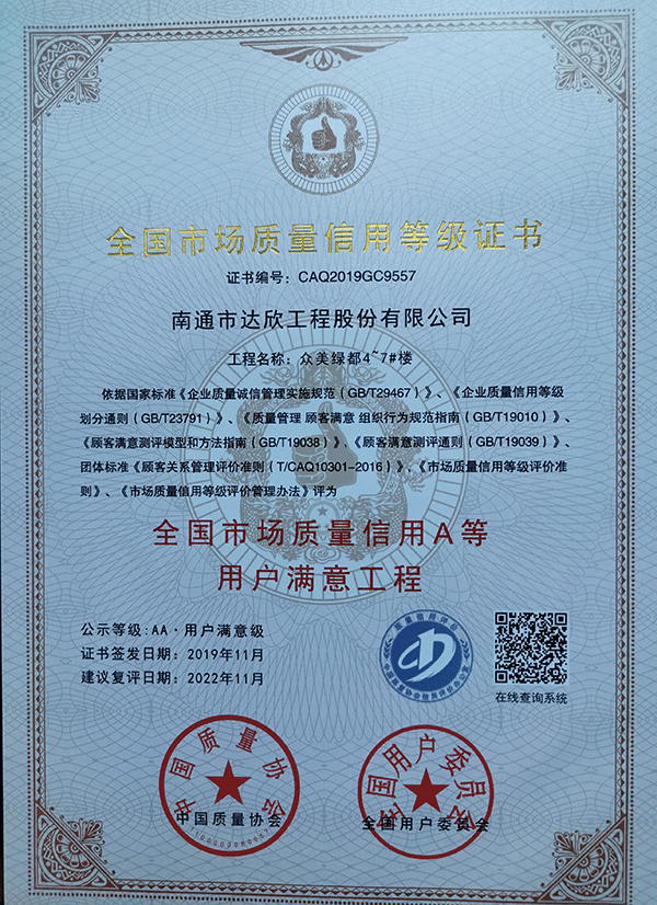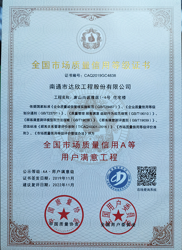 11月19日,由中國(guó)質(zhì)量協(xié)會(huì)主辦的“2019年全國(guó)市場(chǎng)質(zhì)量信用A等(用戶(hù)滿(mǎn)意)中國(guó)年會(huì)”在珠海召開(kāi)。由達(dá)欣集團(tuán)第一工程公司承建的旭輝鉑悅府、第四工程公司承建的眾美綠都4-7號(hào)住宅樓、第六工程公司承建的唐山尚誠(chéng)雅居1-4號(hào)住宅樓獲得“2019全國(guó)市場(chǎng)質(zhì)量信用A等用戶(hù)滿(mǎn)意工程”.