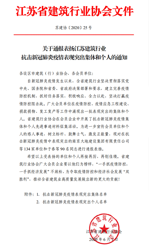 日前,公司獲得江蘇省建筑行業(yè)抗擊新冠肺炎疫情表現(xiàn)突出集體,黨委書記劉厚純獲得江蘇省建筑行業(yè)抗擊新冠疫情表現(xiàn)突出個(gè)人。
