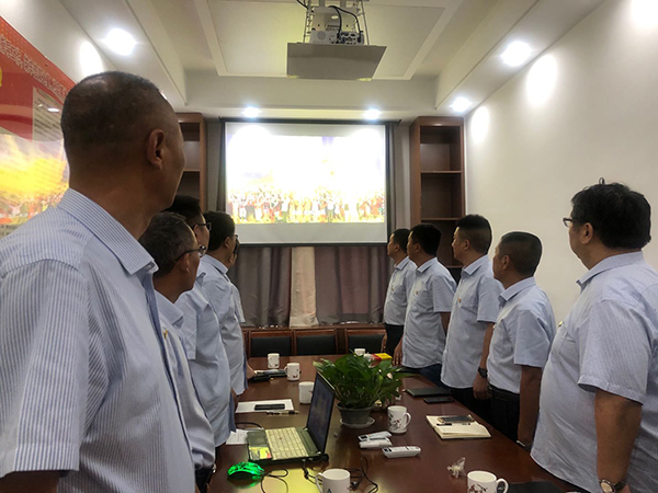 6月30日下午,第三工程公司支部全體黨員在齊唱高亢的國歌聲中開始了紀(jì)念黨的99華誕系列活動。