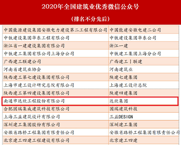 近日,由建筑時(shí)報(bào)社主辦的2020年建筑業(yè)微信公眾號(hào)運(yùn)維經(jīng)驗(yàn)交流研討會(huì)暨2020年全國(guó)建筑業(yè)優(yōu)秀微信公眾號(hào)頒獎(jiǎng)典禮在揚(yáng)州召開。會(huì)上,公布了2020年全國(guó)建筑業(yè)“最具影響力”微信公眾號(hào)和2020年全國(guó)建筑業(yè)優(yōu)秀微信公眾號(hào)榜單。達(dá)欣集團(tuán)獲得2020年全國(guó)建筑業(yè)優(yōu)秀微信公眾號(hào)。