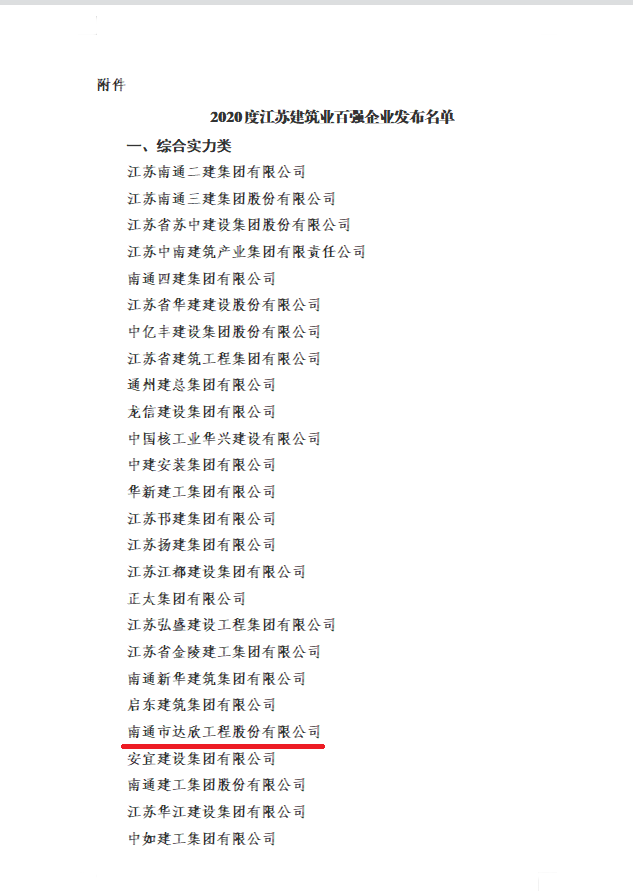 江蘇省住房城鄉(xiāng)建設廳、江蘇省統(tǒng)計局、江蘇省商務廳聯(lián)合發(fā)布2020年度全省建筑業(yè)“百強企業(yè)”名單,南通市達欣工程股份有限公司以卓有成效的業(yè)績連續(xù)七年榮登百強企業(yè)榜單,綜合實力類排名第22名。