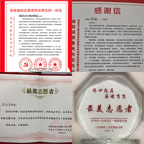 近日,公司陸續(xù)收到來自中共上海市虹口區(qū)四川北路街道工作委員會、街道辦事處、新冠疫情防控工作領(lǐng)導小組對集團第一工程公司廣大職工、第八工程公司劉旭,以及中共嘉定區(qū)江橋鎮(zhèn)綠二社區(qū)對第八工程公司倪慶龍,在上海疫情期間,積極投身社區(qū)疫情防控志愿服務(wù),不懼風雨、不辭辛苦,始終堅守助力打贏上海疫情阻擊戰(zhàn)的基層戰(zhàn)場,所展現(xiàn)出的大愛、擔當、奉獻精神,表示感謝和慰問。倪慶龍獲得“最美志愿者”稱號。