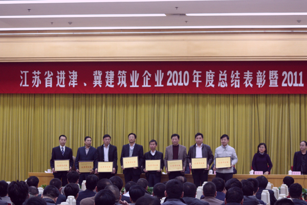2011年3月20日,江蘇省進津、冀建筑業(yè)企業(yè)2010年度總結(jié)表彰暨2011年工作大會在天津大禮堂隆重召開。大會由江蘇省建設(shè)廳駐天津辦事處副主任韓勁松主持,主任鄧福林作了“搶抓新機遇,謀劃新發(fā)展,不斷開創(chuàng)江蘇建筑業(yè)新局面”的工作報告,對2010年的工作進行回顧,并提出2011年工作目標(biāo)任務(wù)。江蘇省建筑工程管理局副局長紀迅、天津市外地施工隊伍管理站站長吳海、江蘇省住房和城鄉(xiāng)建設(shè)廳監(jiān)察室主任王毅、計劃賬務(wù)處調(diào)研員徐和美等江蘇省、天津市的主管部門領(lǐng)導(dǎo)應(yīng)邀出席了會議,紀迅局長、吳海站長作了重要講話。