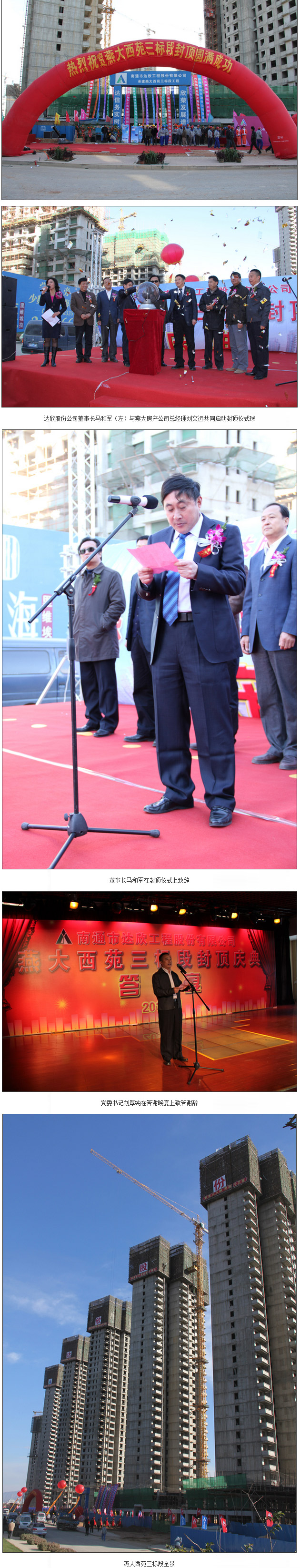2009年11月10日,我公司承建的河北省秦皇島市燕大西苑三標段工程(5棟框剪結構住宅樓及地下車庫、商業(yè),地上34層,地下2層,總建筑面積96151㎡)在燕大房地產(chǎn)開發(fā)有限公司負責人刑廣忠的一聲號令下啟動了開工儀式,2010年11月8日,由我公司董事長馬和軍與燕大房地產(chǎn)開發(fā)有限公司總經(jīng)理劉文遠共同啟動封頂儀式球,宣布燕大西苑三標段提前圓滿封頂。