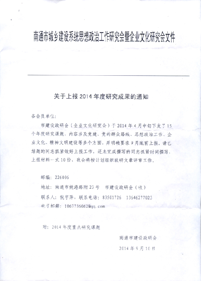 關(guān)于上報2014年度研究成果的通知